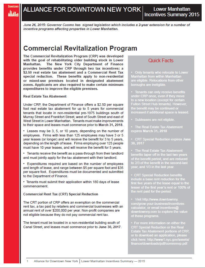 The Downtown Office Rent Rebate program known as the Lower Manhattan Commercial Revitalization Program has been extended to March 31, 2018. Participation in this municipal incentive program substantially reduces occupancy costs for qualified businesses.