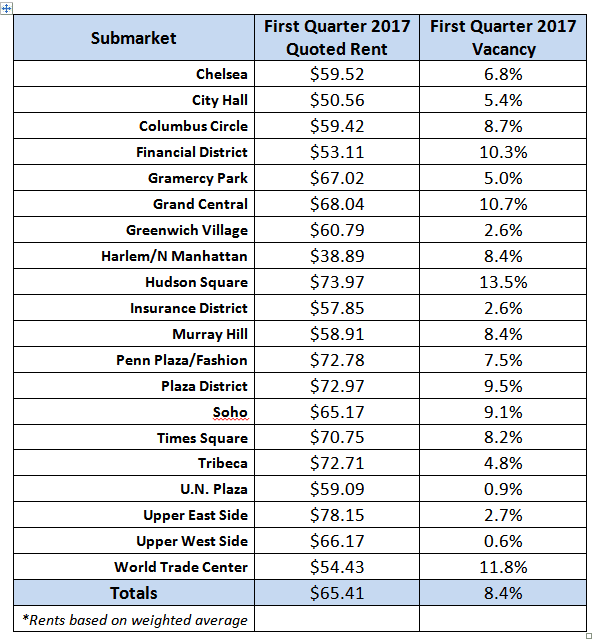 The average quoted rent in the NYC office market across all building classes was $65.41 per square foot with a vacancy rate of 8.40%.