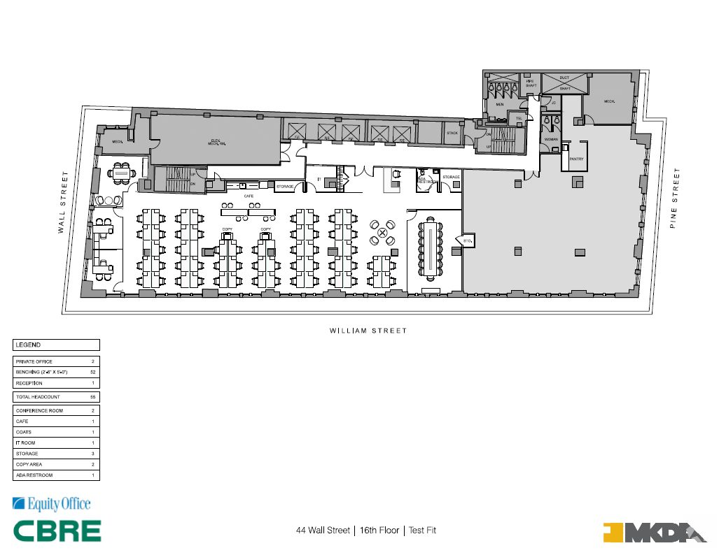 44 Wall Street: 342,000 SF Class B office building. 24/7 access and attended lobby. Multiple fiber providers. Remarks: Located at the corner of William Street. New lobby and elevators. There is a Prime Office Center shared office space provider on the 12th and 13th floor.