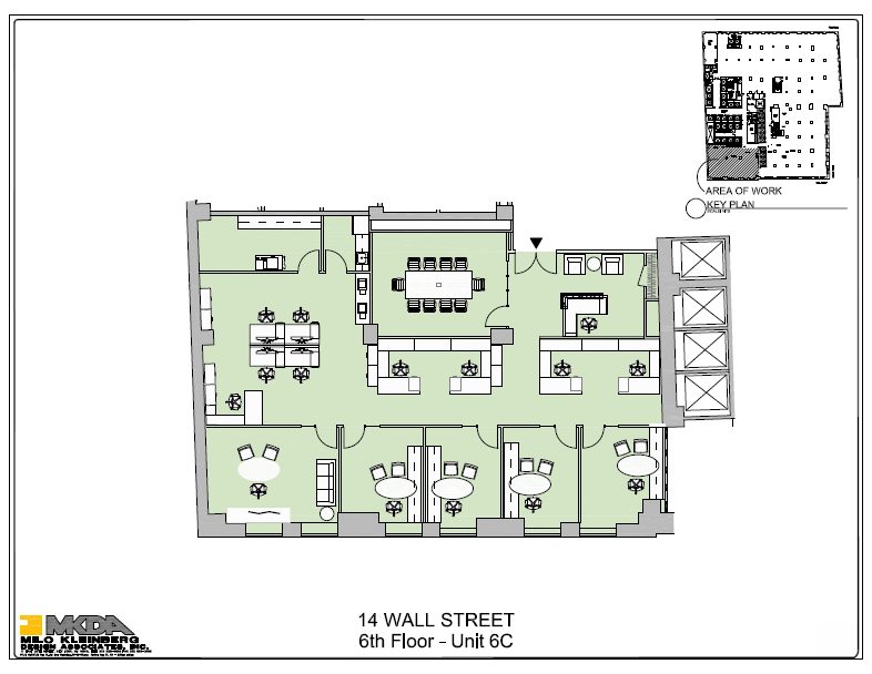 14 Wall Street: 1,049,292 square foot Class A office building. 24/7 access and attended lobby. Multiple fiber providers. Remarks: Large well managed building. Busy entrance. There is a Regus shared office space provider on the 20th floor.