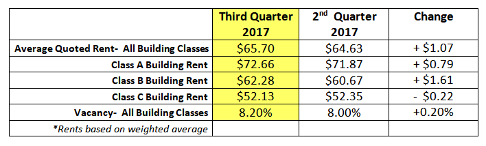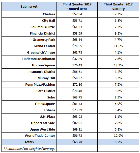 In the Third Quarter of 2017 the average quoted rent in the NYC office market across all building classes was $65.70 per square foot. This represents a $1.07 PSF increase compared to Q2. The vacancy rate in Q3 was 8.2% compared to 8.0% in Q2.