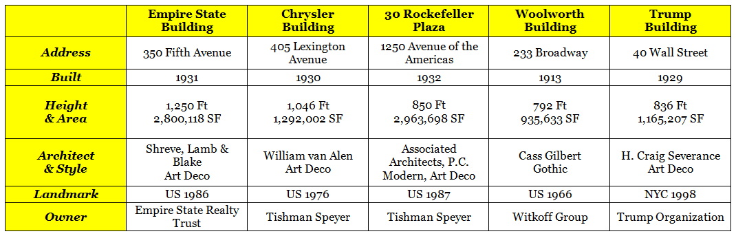 TOP 5 New York City Landmark Office Buildings include the Empire State, Chrysler, 30 Rockefeller Center, Woolworth and Trump. These venerable buildings are recognized the world-over as symbols of American prosperity. Corporations leasing office space in these historic towers enjoy near instant credibility in the international business community. But the benefits of renting work space here are more than “skin deep”; each provides an elegant office environment, cutting-edge technology, Class A service and professional building management.