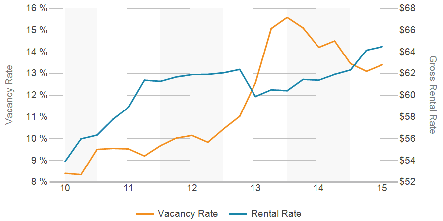 At mid-year 2015 the availability of trading offices and technology offices near Grand Central is limited and rents are at a premium. This mirrors the overall market conditions throughout Manhattan. (Link to our report on NYC Office Space Cost in Q2 2015 here.) Costar, the Commercial Real Estate Information Company reports that at the close of the second quarter the vacancy rate in the Grand Central Station sub-market was 11% with an average asking rent of $63.84 per rentable square foot across Class A, B and C buildings. The adjacent chart shows data over the past five years.